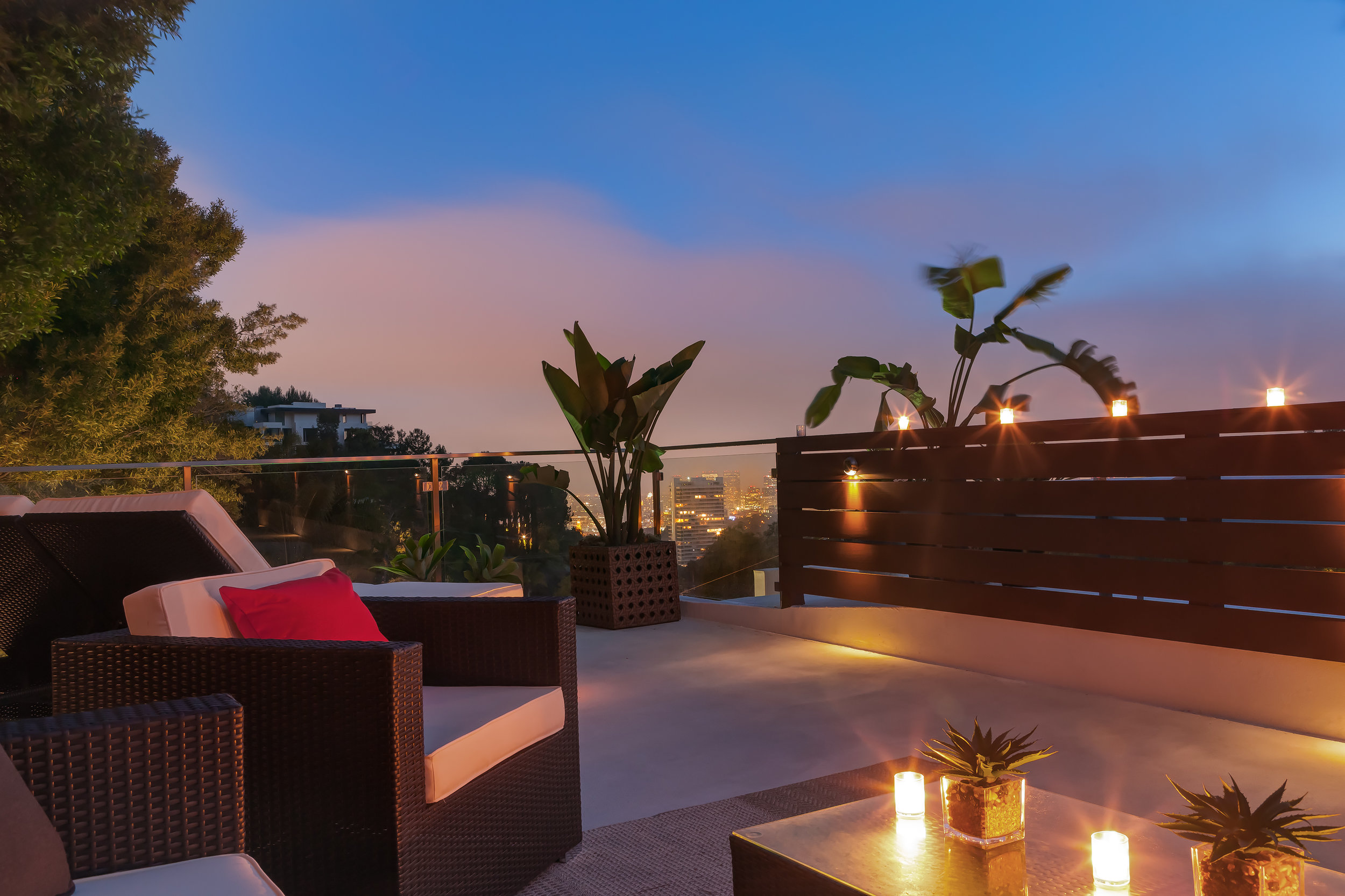 Nestled above the famous Sunset Strip, a contemporary three-bedroom home with rooftop skyline views of the city perfect for the entering nights.